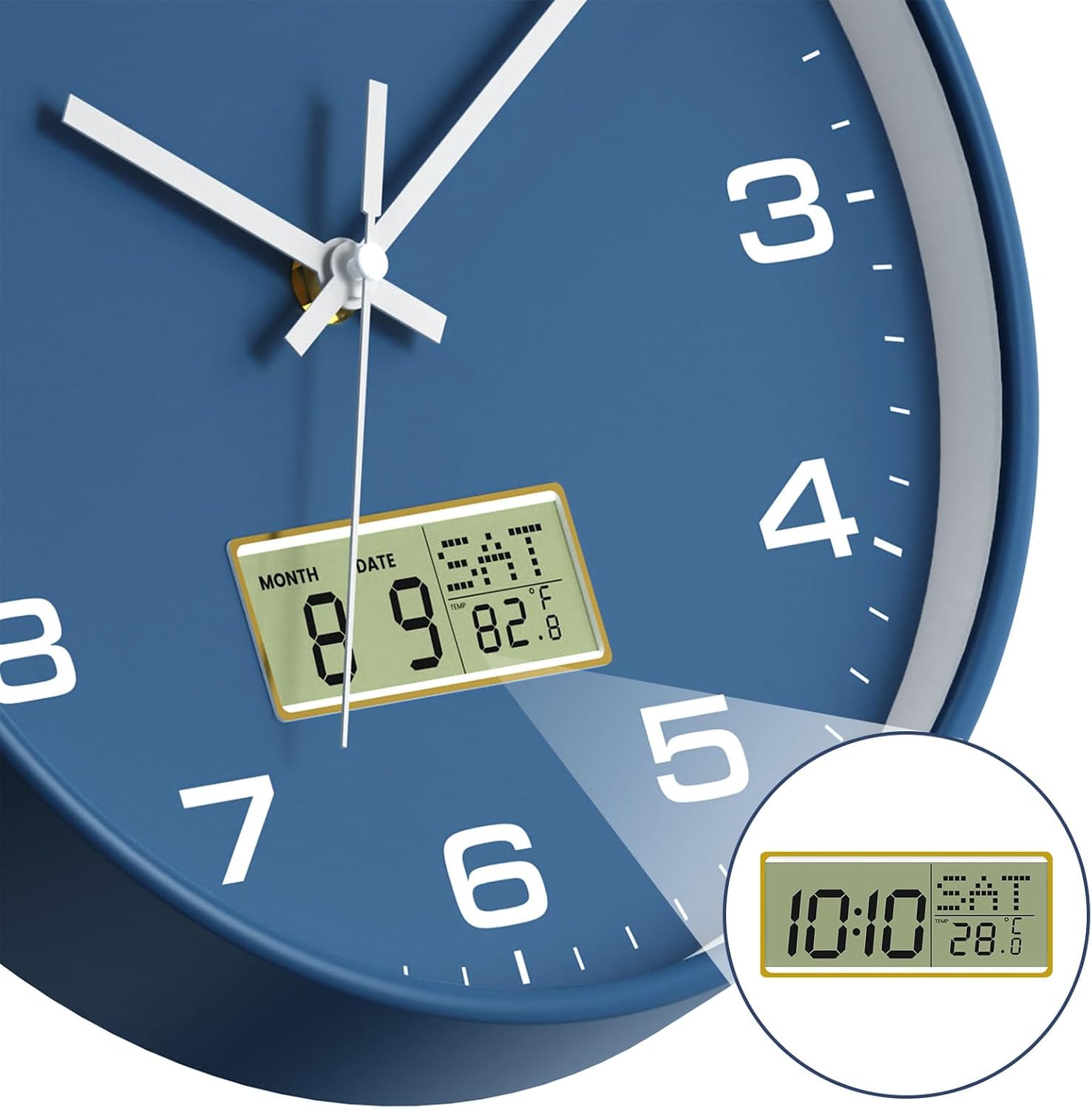 12″ CLASSIC ANALOG CLOCK:The blue dial with bold white numerals offers clear, easy time reading at a glance. A piano-gloss frame adds a refined touch, enhancing both modern and traditional interiors