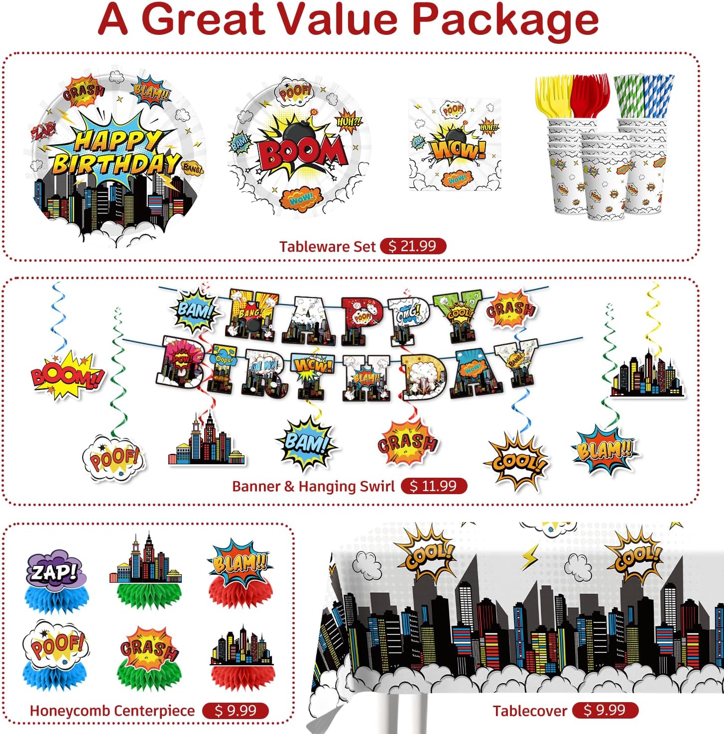 【Unique design:】 Our party set includes various onomatopoeias of explosions and silhouettes of cities, with bright and lively colors. the overall picture is full of vitality and fun, with a strong visual impact, which can well attract people’s attention and leave a deep impression on them, creating an unforgettable theme birthday party or gathering