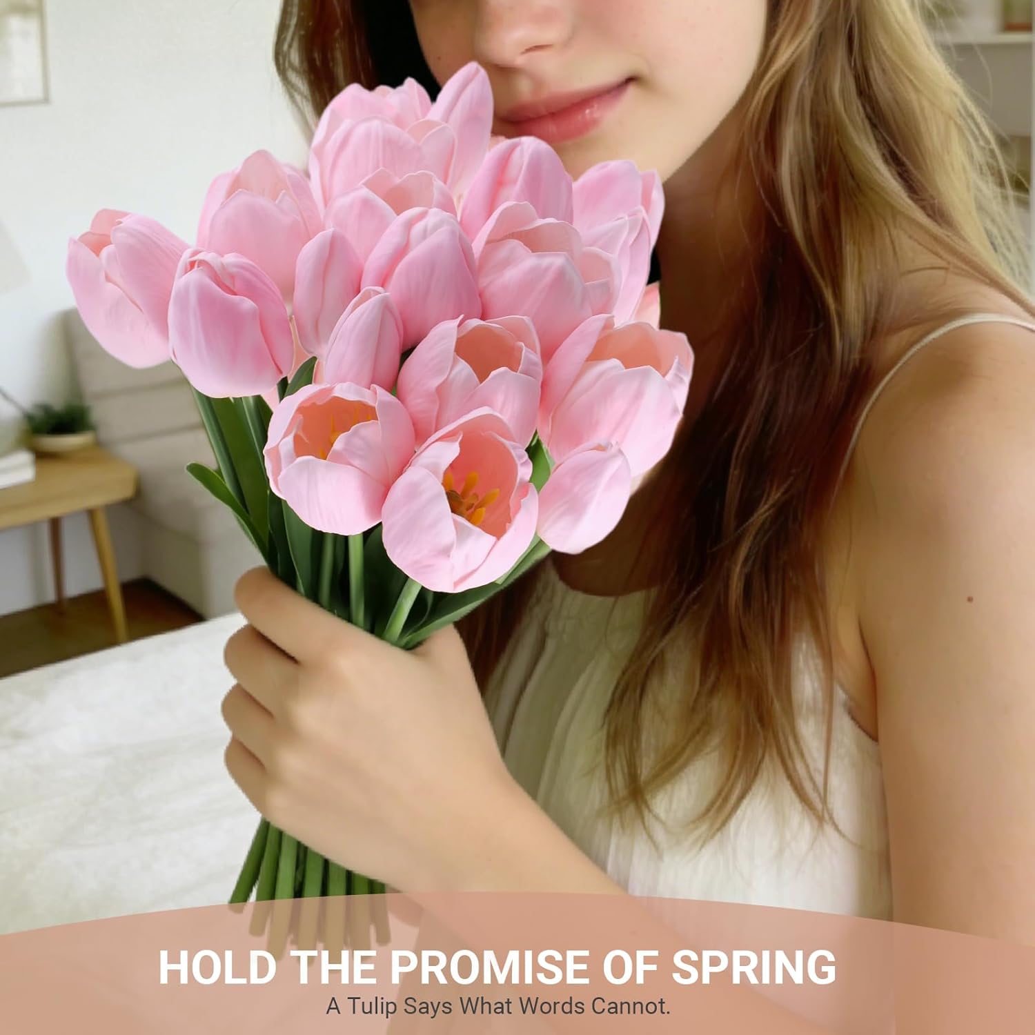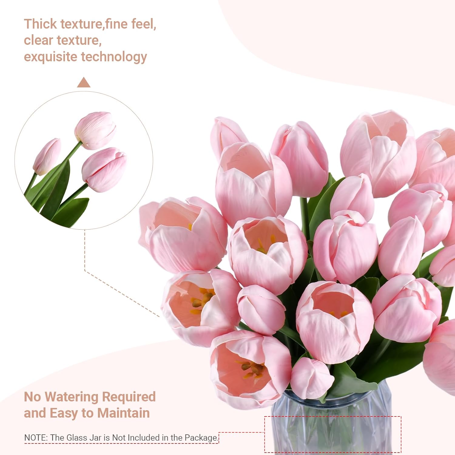 The package includes 20 stems of 16-inch artificial pink tulips but does not contain a glass bottle or vase. To complete your arrangement, pair these tulips with your own container, such as a ceramic vase, wooden box, or decorative pitcher.