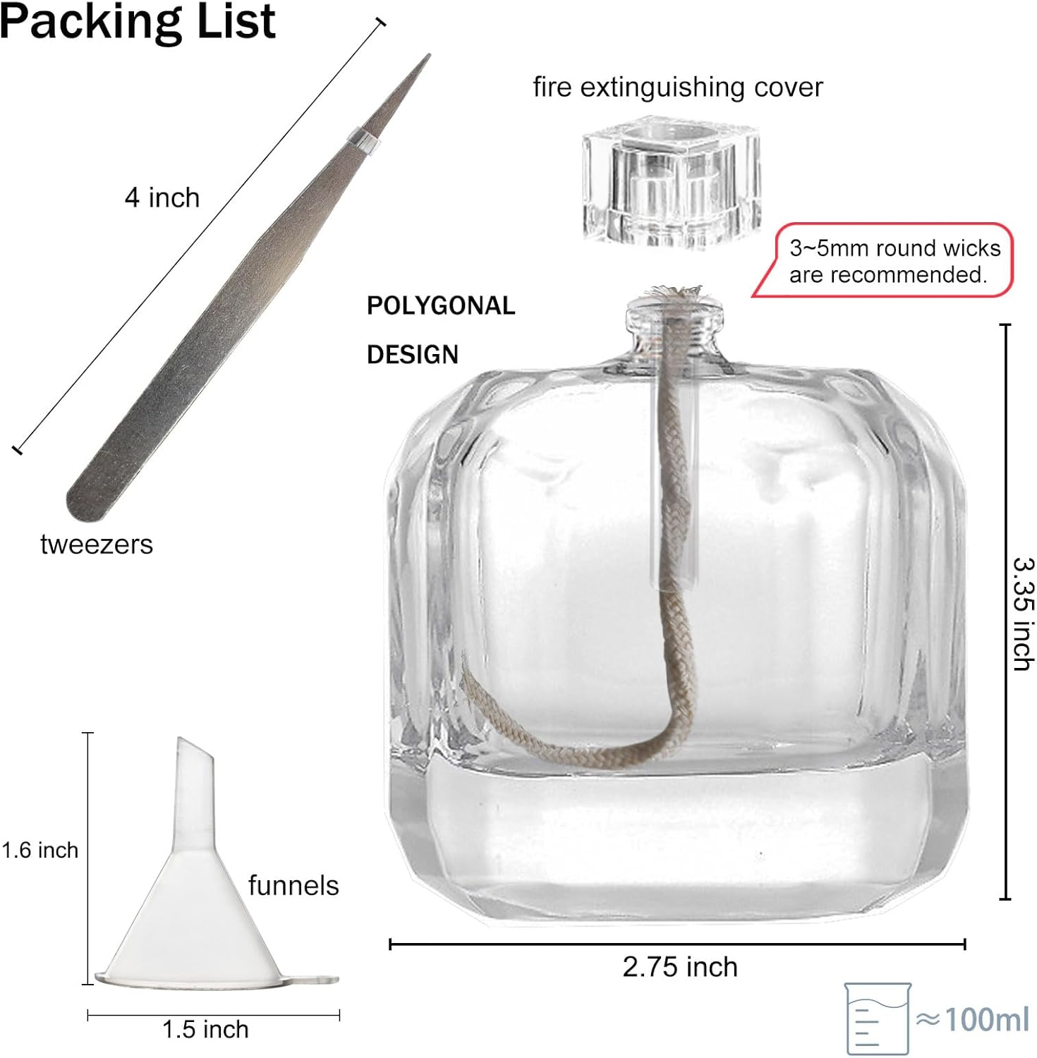 Dimensions – 3.35 x 2.75 inches (H x D); Capability 100ml/3.4oz; Comes with cotton wick funnel, tweezers, burner tube and different equipment.