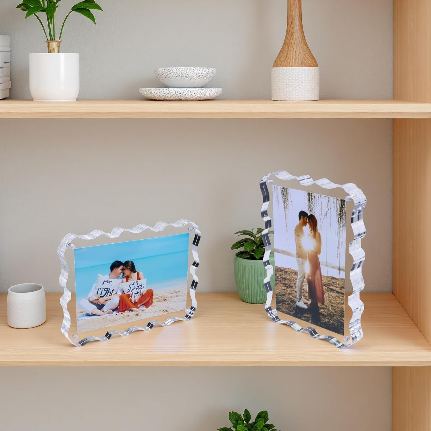 – Magnetic clear acrylic picture body with wavy edge — Double-sided floating show, freestanding tabletop image body for desk, shelf, dwelling and workplace.