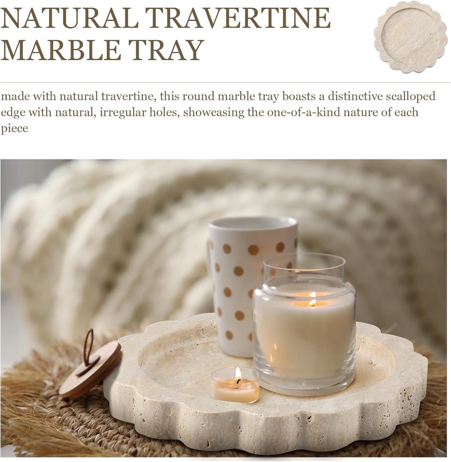 Pure Travertine Marble Tray: made with pure travertine, this spherical marble tray boasts a particular scalloped edge with pure, irregular holes, showcasing the one-of-a-kind nature of every piece; Its pure shade seamlessly blends with most design scheme, imbuing an air of understated class to your private house