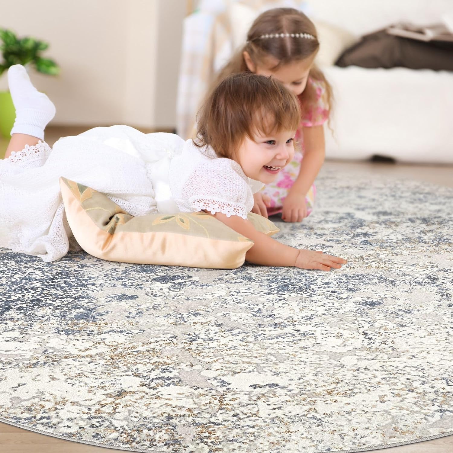 8ft Round Area Rug Living Room Rugs – 8×8 Washable Large Soft Indoor Neutral Modern Abstract Low Pile Rug Carpet for Bedroom Dining Room Farmhouse Home Office – Beige Blue