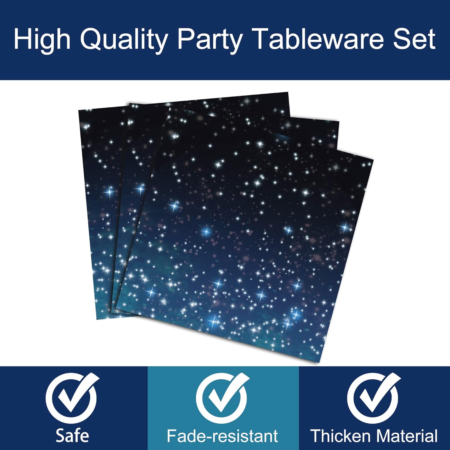 Vibrant Space Party Design: Except for the fork, this galaxy theme party tableware set is all designed in dark blue outer space color ans galaxy stars. Decorating your space party with these tableware kit can make your party full of the dreamy galaxy atmosphere.