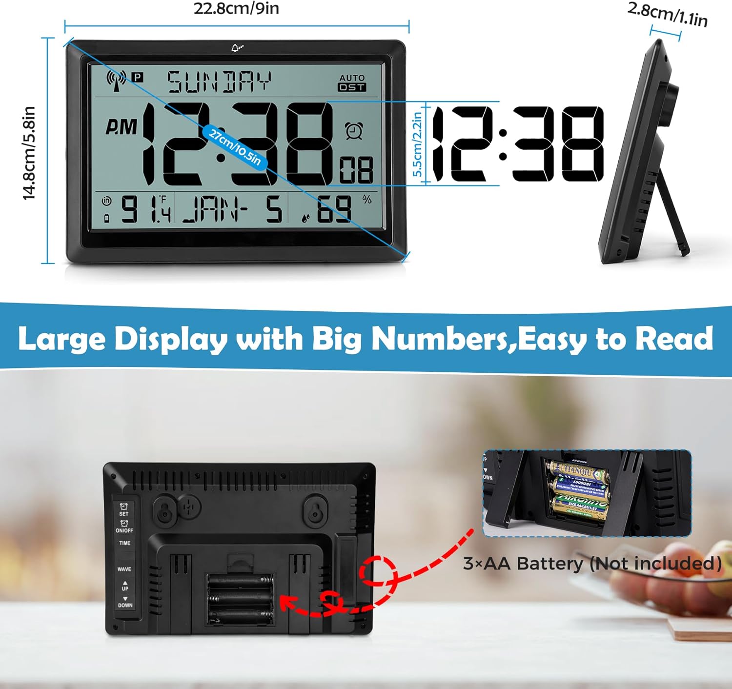 The Amgico Digital Wall Clock combines essential timekeeping with environmental monitoring in a sleek, user-friendly design tailored for everyday use. With its 10.5-inch large display, this digital calendar clock delivers clear visibility across rooms—making it ideal for seniors, individuals with visual impairments, or anyone who prefers easy-to-read information without squinting. Powered by three AA batteries (not included), it operates silently and requires no outlet access, offering installation flexibility in homes, classrooms, offices, or senior living spaces. More than just a clock, it functions as an all-in-one daily reference panel, displaying accurate time, date, day of the week, indoor temperature, and humidity—all automatically synchronized via atomic radio signals.