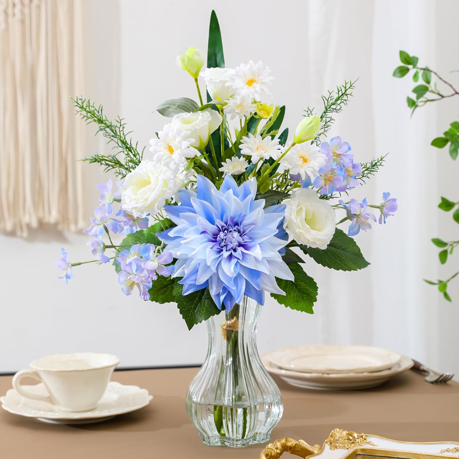 This stunning artificial flower bouquet from FLORRALIA brings lasting elegance and natural beauty to any indoor space. Standing at 18.9 inches tall and 13 inches wide, it features a thoughtfully curated mix of vibrant blue dahlias, soft white roses, delicate peony buds, charming small wildflowers, and lush green foliage. Crafted with premium faux silk materials, this arrangement delivers a realistic appearance that closely mimics the texture and color depth of fresh blooms—without the need for maintenance or seasonal replacement. Whether used as a centerpiece, decorative accent, or event styling element, this bouquet maintains its radiant look year-round, making it an ideal choice for home décor enthusiasts, wedding planners, and anyone seeking timeless floral beauty.