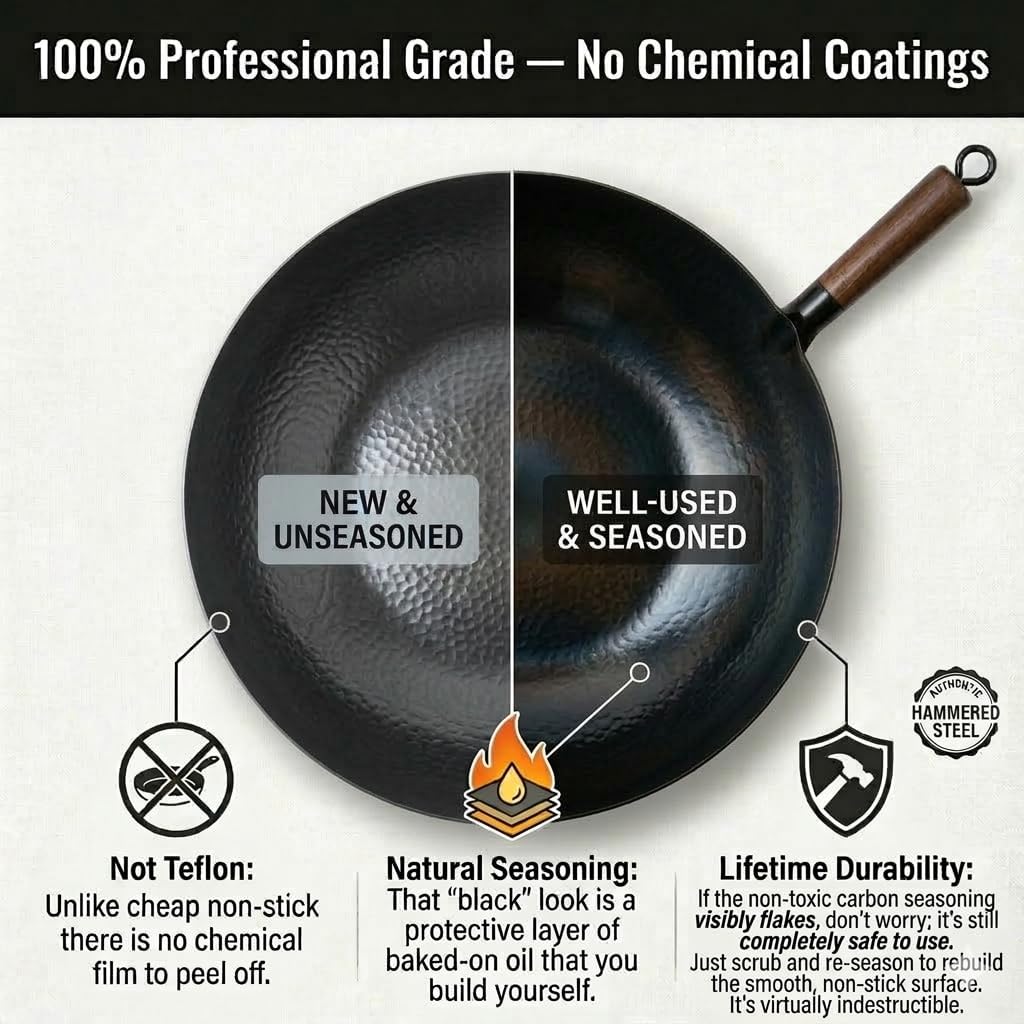 - No Chemical Coating: Free from non-stick chemicals or synthetic layers, the wok promotes healthier cooking and avoids potential flavor transfer from coatings, preserving the natural taste of ingredients.