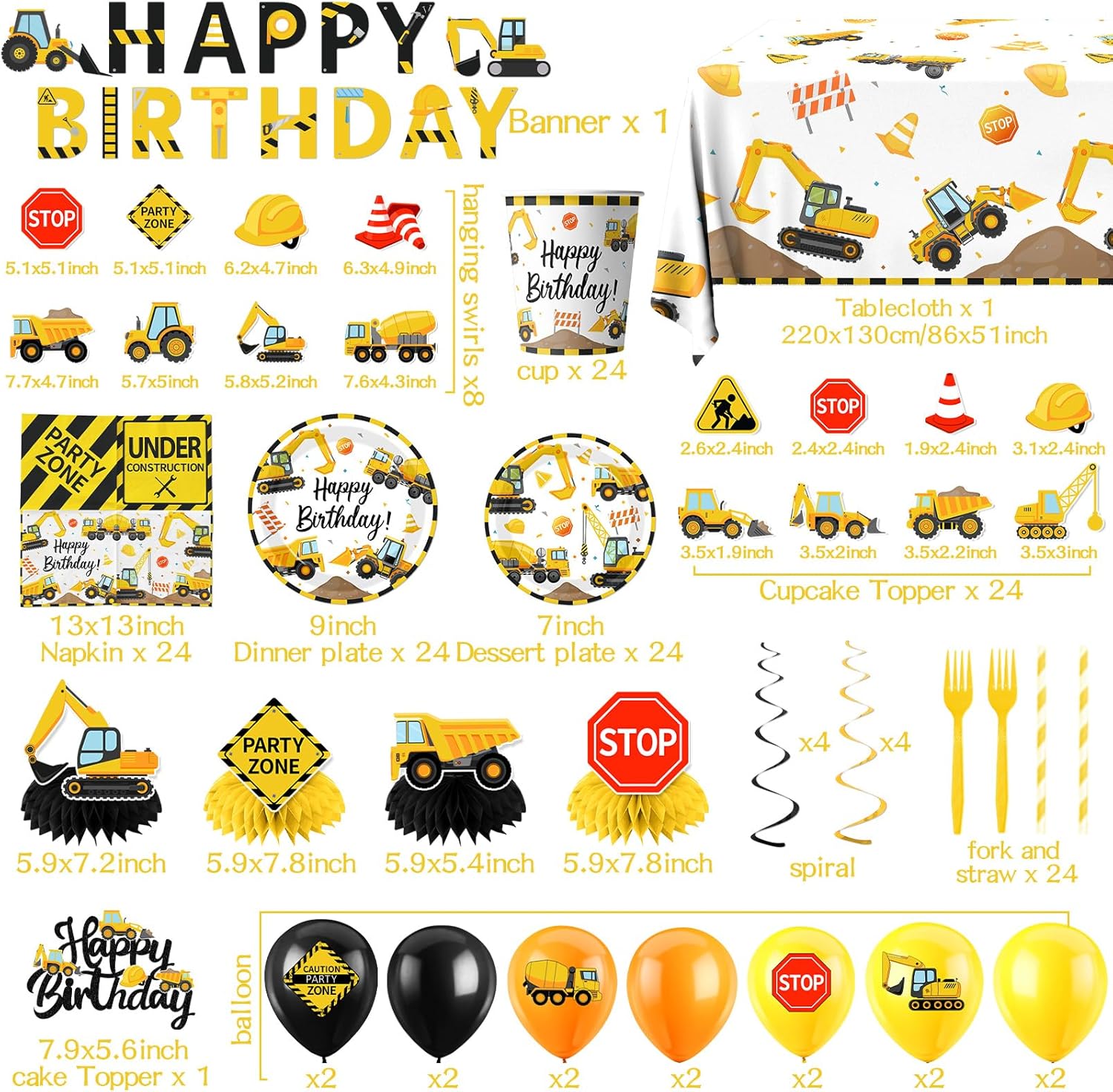 Building Get together Decorations: This building celebration provides set contains 24 building celebration plates (9 inches),24 building plates( (7 inches),24 building napkins,24 cups,24 forks strawsx,6 honeycomb,24 building cupcake toppers,8 hanging swirls,14 building celebration balloons(4 types),1 banner