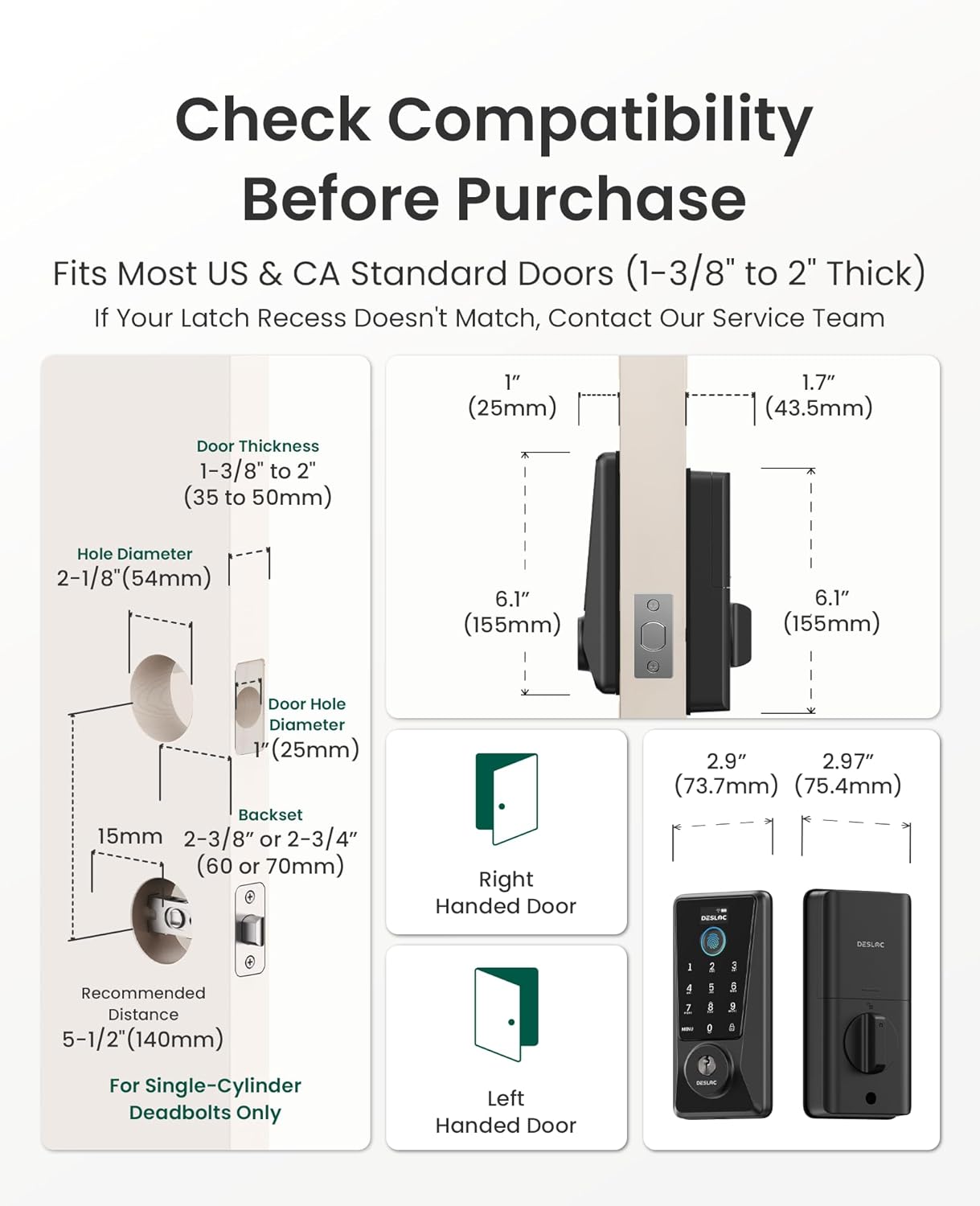 Door Type Compatibility: The Desloc Fingerprint Electronic Door Lock is designed to work with standard residential doors with door thickness between 1-3/8 to 2 inches and adjustable backset of 2-3/8 or 2-3/4 inches for quick replacement, Ideal for homes, apartments, Rental & garage entry