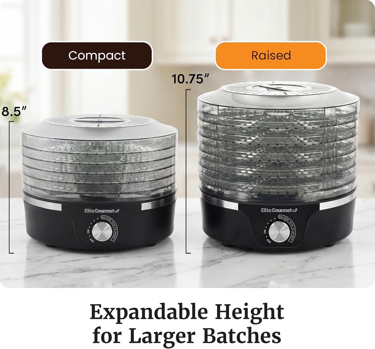 5 EXPANDABLE BPA-FREE TRAYS: Includes five 11.4” clear drying trays that stack from 8.5” to 10.75” tall to fit thicker cuts and larger batches. Transparent trays let you monitor progress without opening the lid and losing heat.