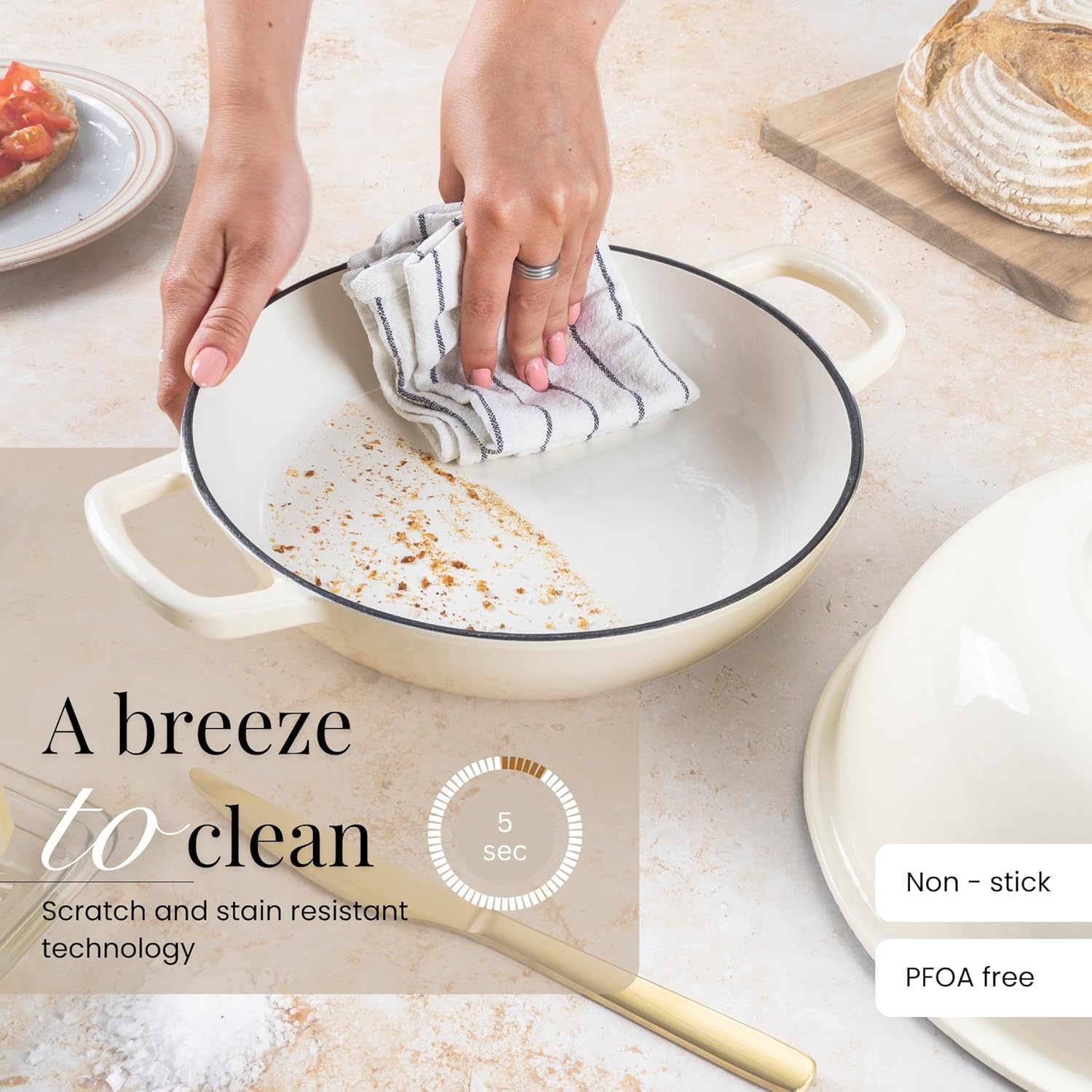 ENAMELLED FINISH: The enamelled floor of the forged iron dutch oven pot by Nuovva is non-reactive, making it secure for all sorts of dough and components. It resists rust and scratches, guaranteeing your pot stays in pristine situation for years. The graceful enamelled end makes cleansing easy!