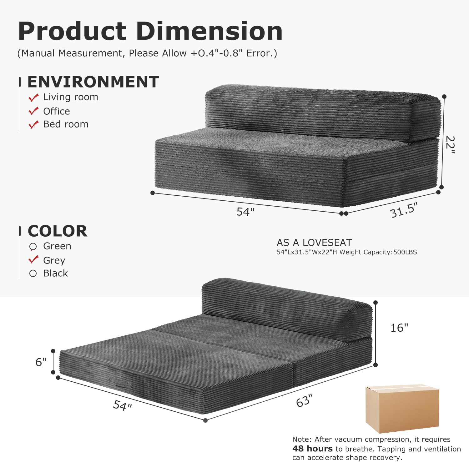 3-in-1 Multifunctional Design: Instantly converts from a supportive folding sofa to a 6-inch thick floor mattress or guest futon bed—ideal for small spaces, unexpected visitors, movie nights, or camping trips. No assembly or tools required