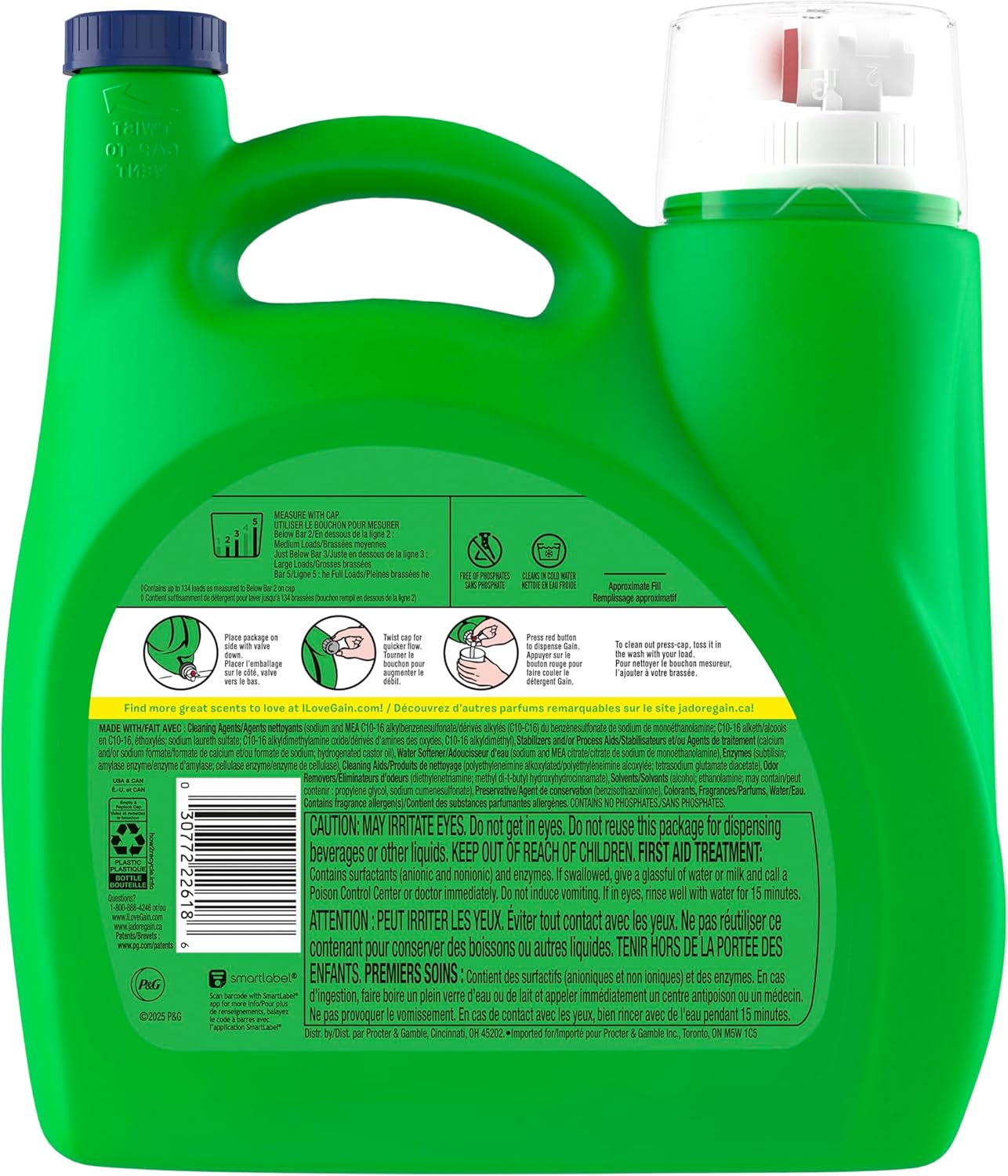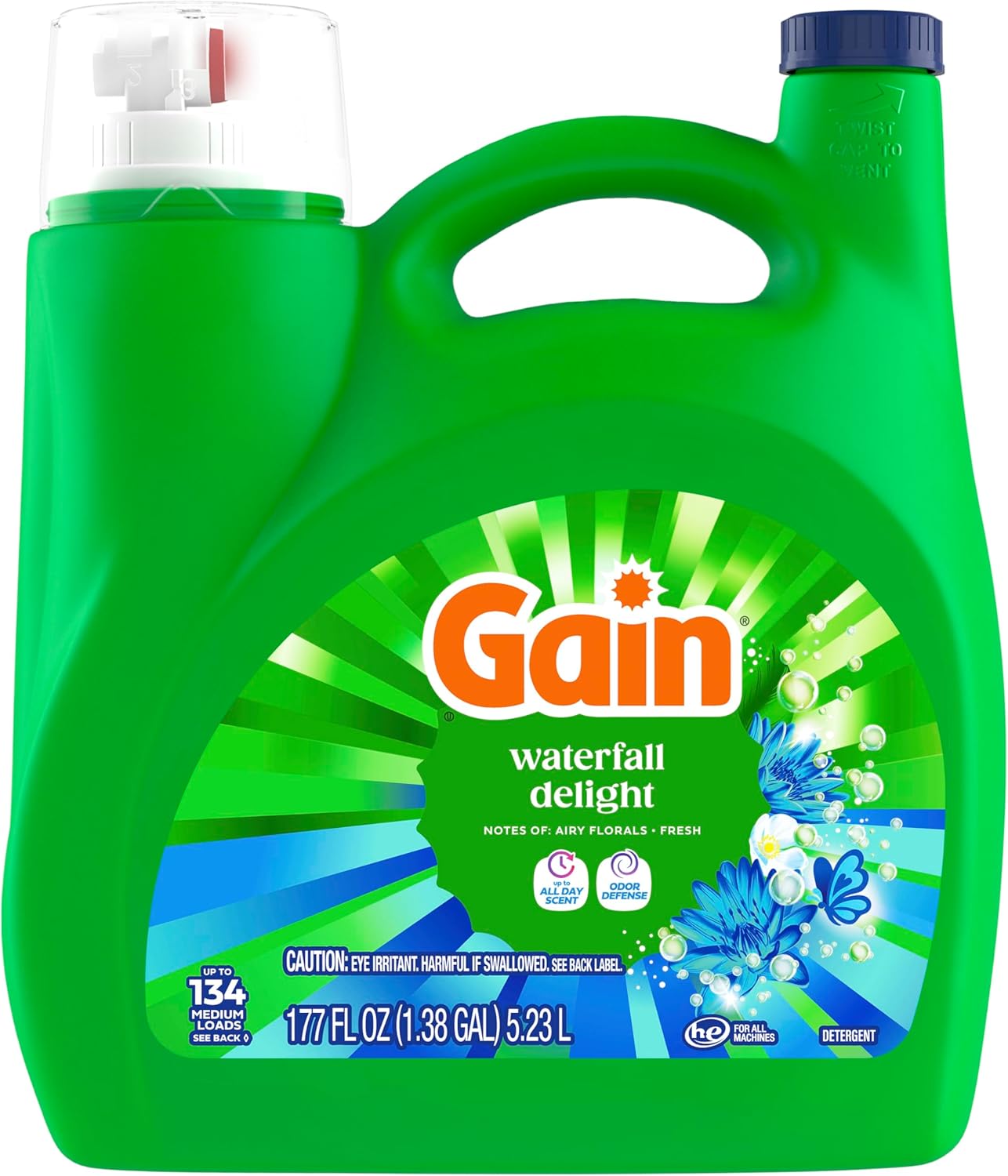 PACKAGE CONTENTS: Includes one jug of 177 fl oz of Gain Liquid Laundry Detergent in Waterfall Delight Scent, Now with Odor Defense, good for 134 Medium Loads