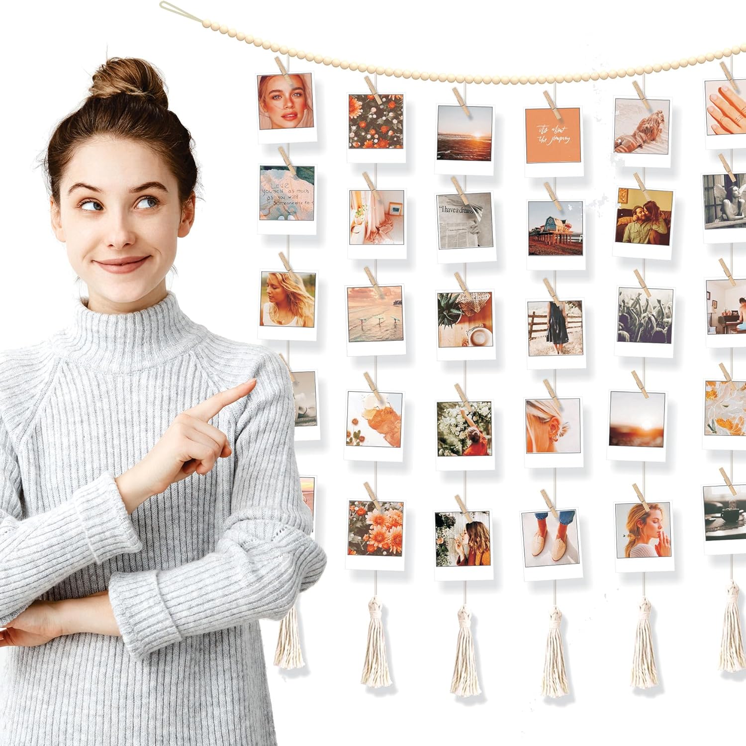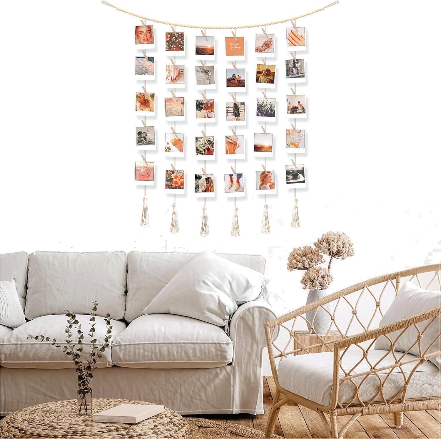 This hanging photo display with clips offers a stylish and flexible way to showcase your favorite memories without the need for drilling or permanent installation. Designed in a boho-inspired aesthetic, it features a bead garland design that adds texture and warmth to any wall space. Perfect for displaying instant photos like Instax and Polaroid images, as well as artwork, greeting cards, and postcards, this decorative frame system brings personal expression to home or dorm rooms.