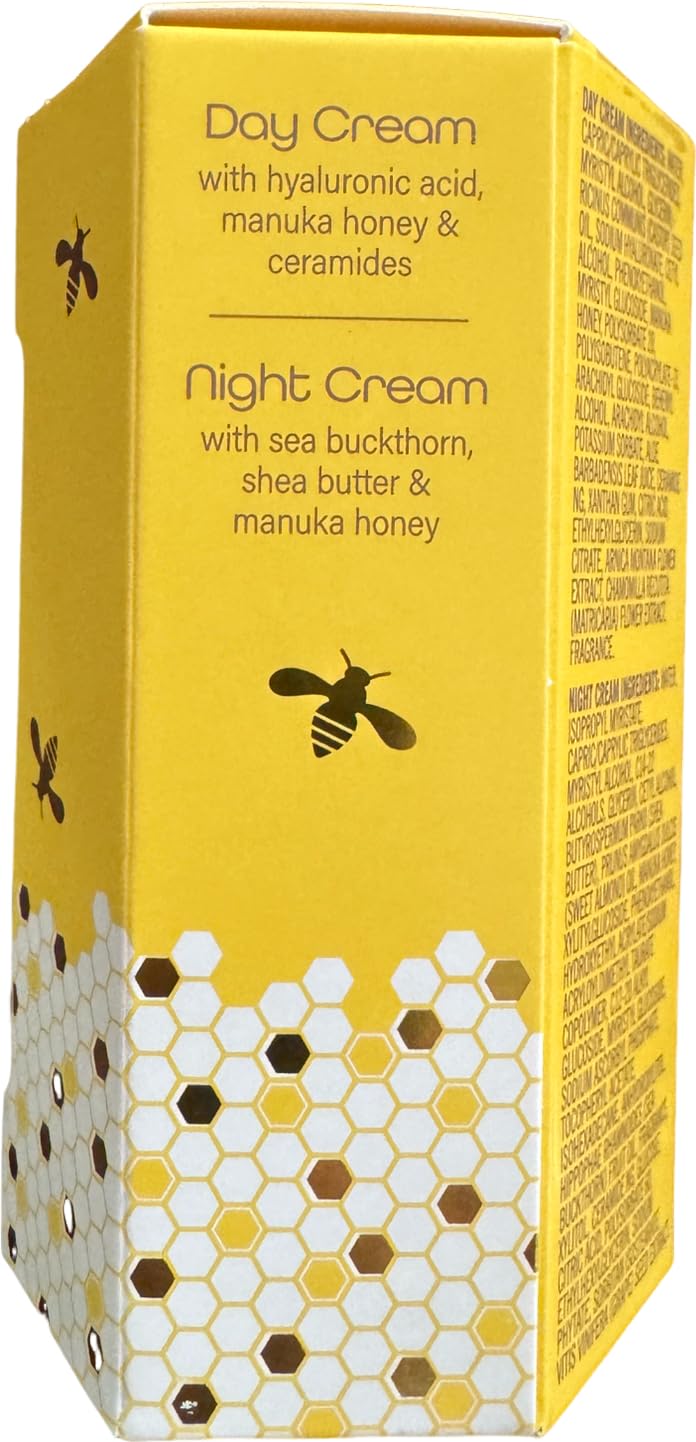 Day cream with hyaluronic acid, manuka honey & ceramides; Evening cream with sea buckthorn, shea butter & manuka honey