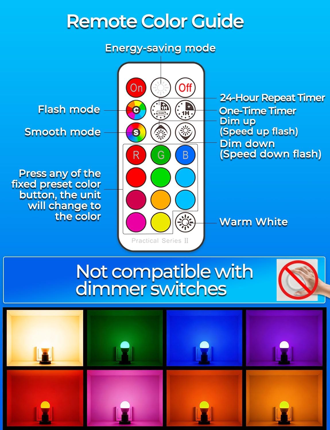 Memory & Synchronization: This light bulb can memory the last color or mode we used. Synchronization is a revolutionary innovation for environments where multiple light bulbs are used together, such as fan lights, bar lamps, chandeliers, table lamps, and more. When we use flash and smooth modes, the rhythm of the color changing of the bulb can always be consistent. Note: One remote control can control all bulbs.