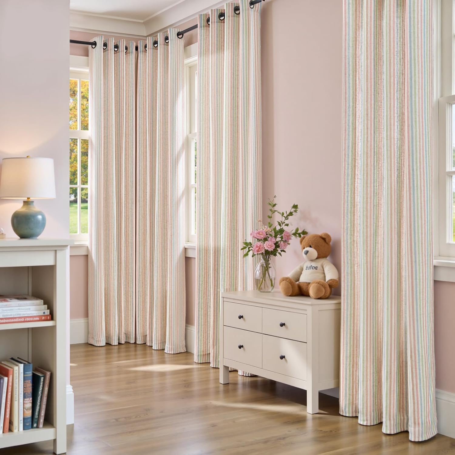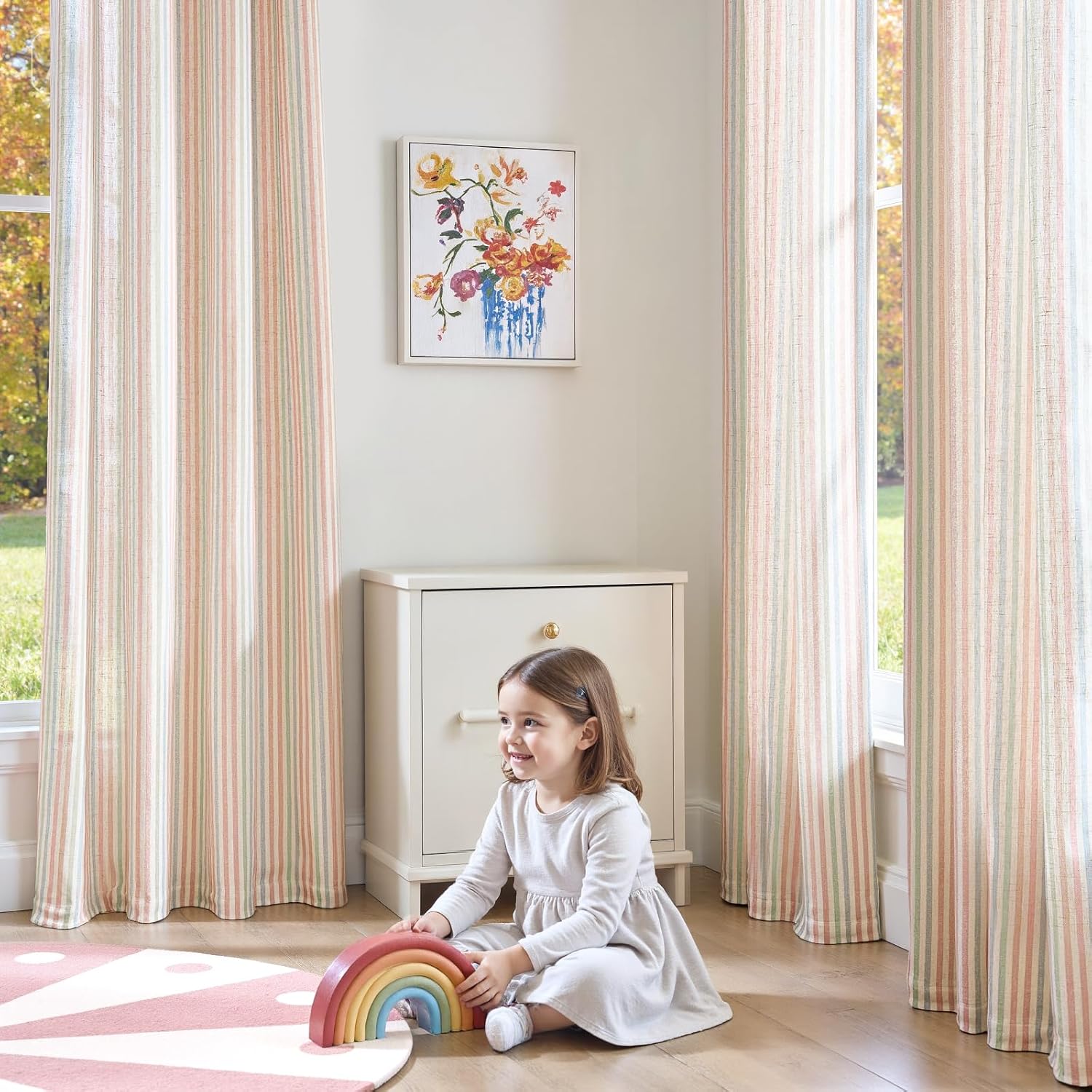 Playful Striped Design – Mushy linen-blend cloth with cheerful multicolor stripes brings a joyful and comfortable contact to a children’ bed room, nursery, or playroom.