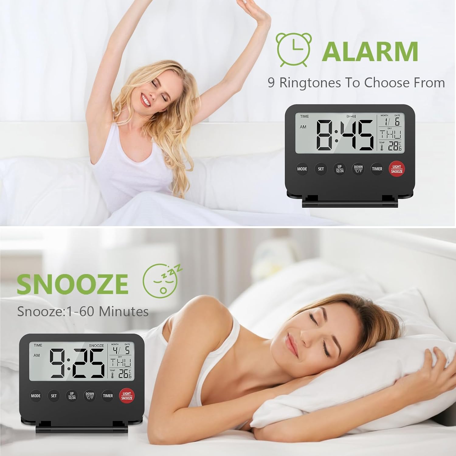 SNOOZE & WAKE UP: Our battery alarm clock includes nine different alarm sounds, providing a gentle wake-up experience, and 0-60 minutes of snooze is optional, so you can ensure that you will never wake up late