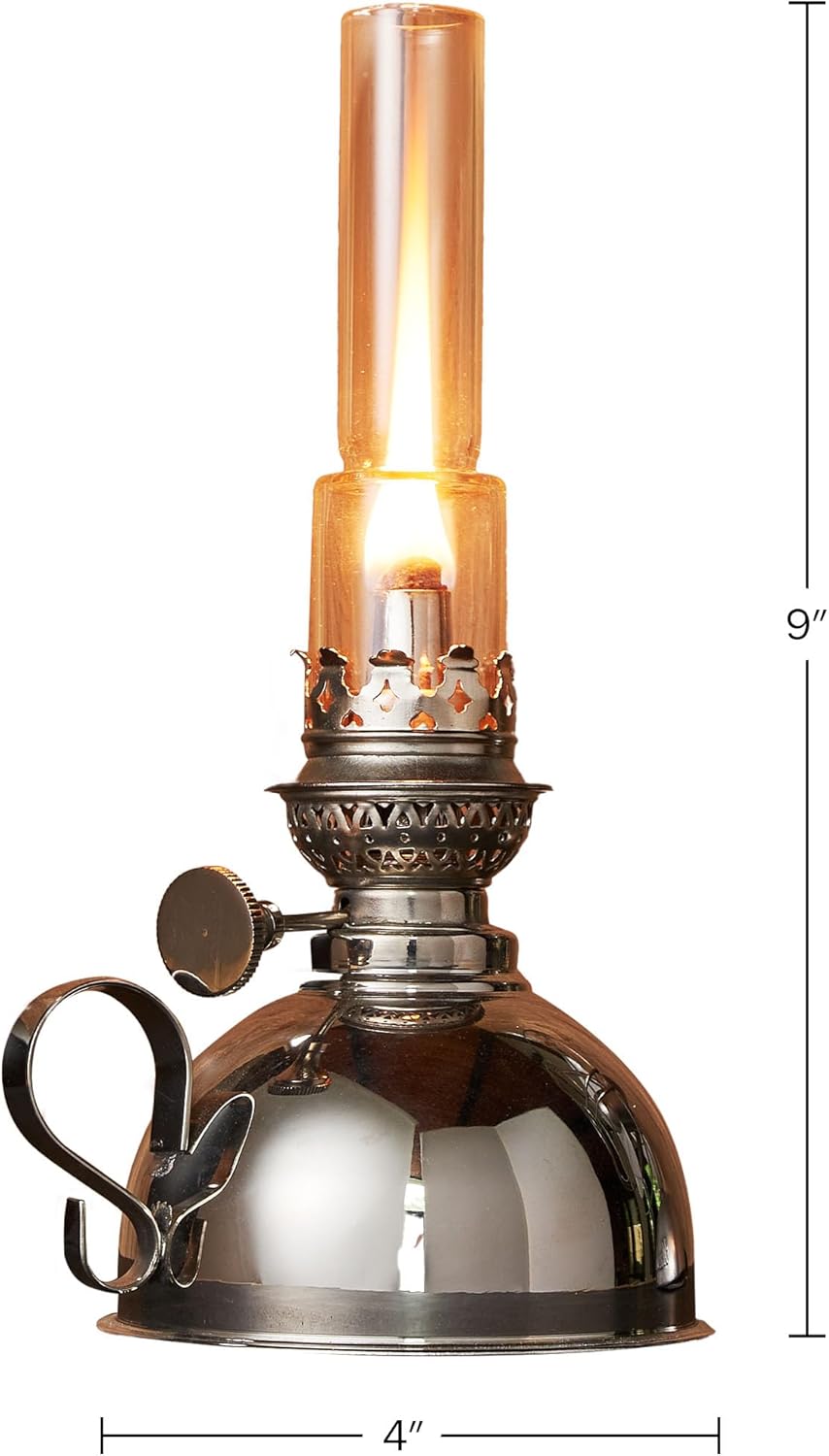 PRODUCT DETAILS – Supplies: Nickel and Glass. Dimensions: (L) 4” x (W) 4” x (H) 9”. Word, Lamp Oil/Kerosene is Not Included with the Lamp and Should be Bought Individually. Coloration: Polished Nickel.