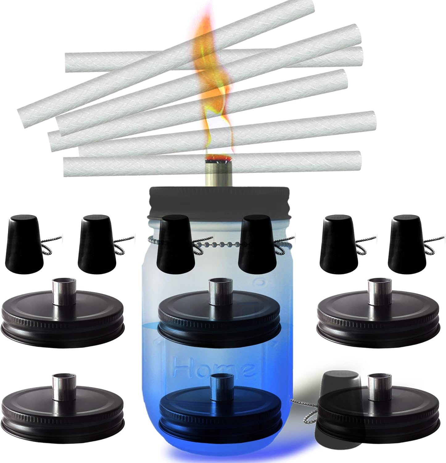 - Complete 6-Pack Set: Includes six durable black mason jar lids, six high-quality fiberglass wicks, six protective tubes, six caps, and six chain attachments—providing all necessary parts to build one functional torch per kit.