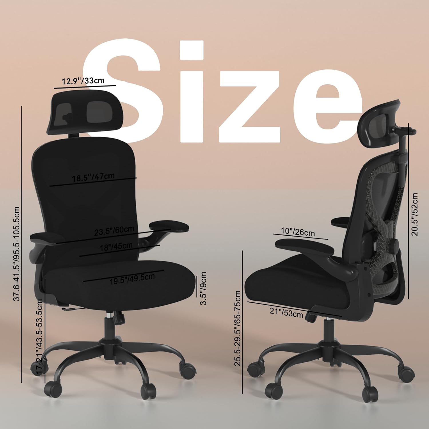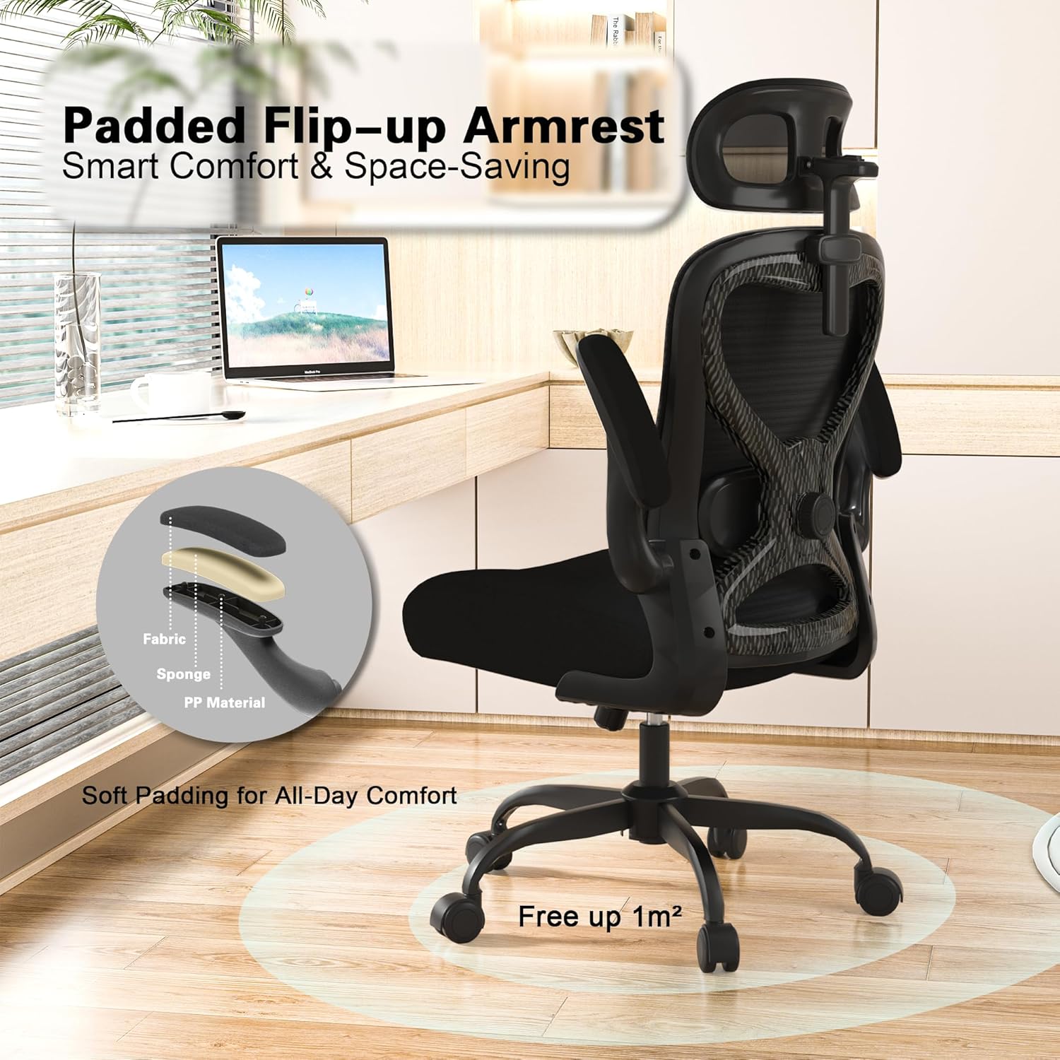 - Flip-Up Armrests: The armrests are equipped with a flip-up function, enabling easy access to the chair’s base for storage under desks or in tight spaces. They also offer standard height and width adjustment for personalized comfort during typing, writing, or resting arms.