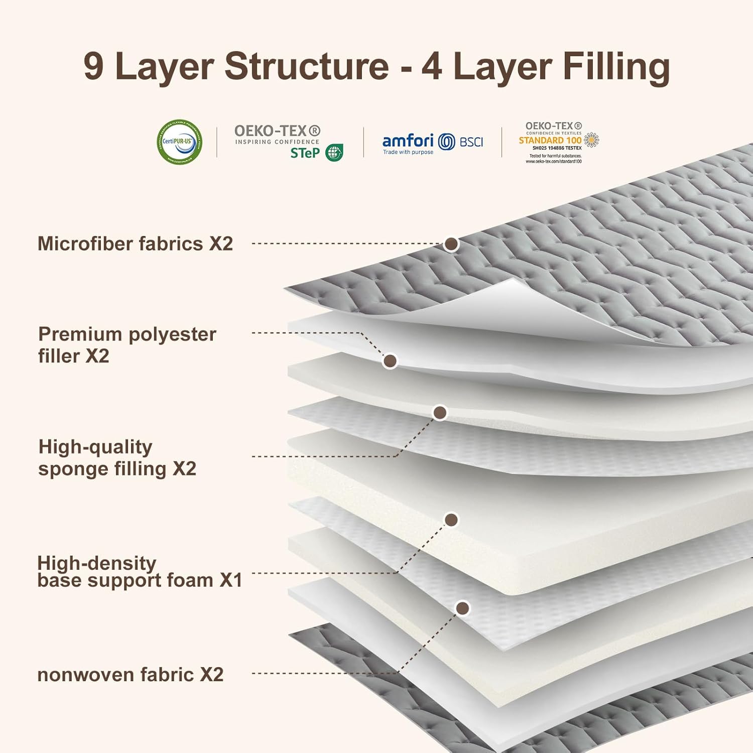 • 100% High-Density Foam Core: Constructed with premium high-density foam that provides consistent support and durability, helping maintain spinal alignment during sleep and resisting sagging over time.