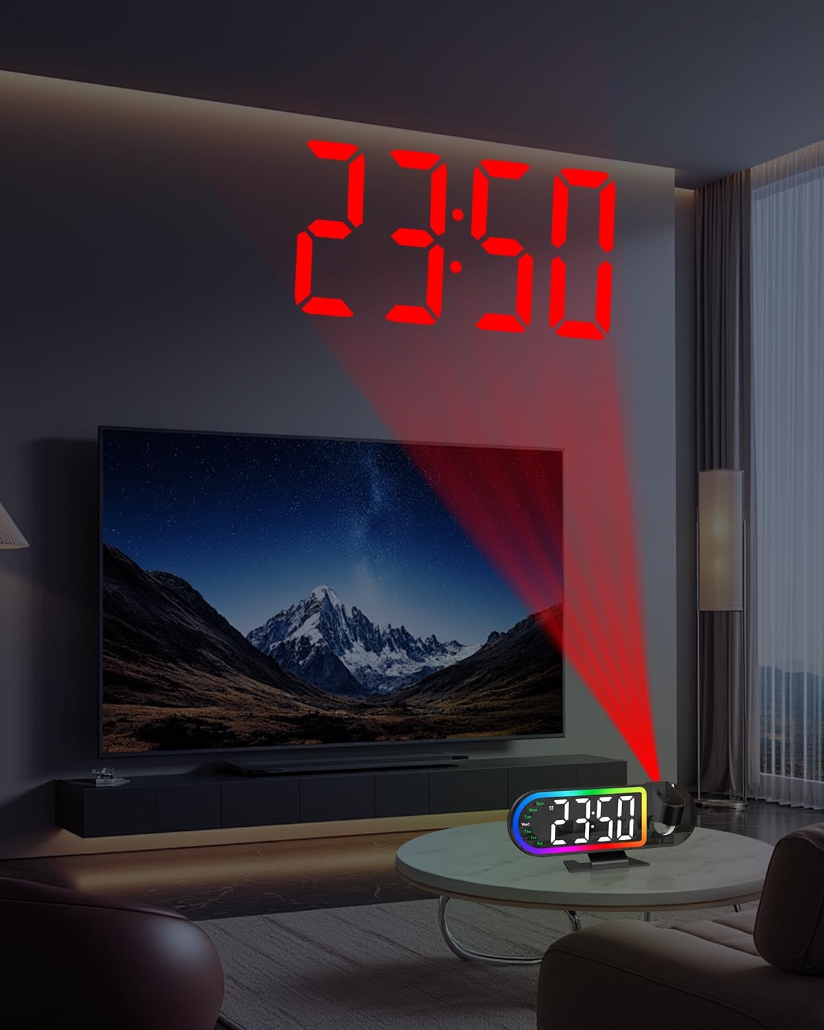 【180° Rotatable Projection Design】This projection alarm clock features an 8.5-inch extra-large screen. The projected clock displays time/temperature/date. Equipped with 3 adjustable projection brightness levels. Note: Projected digits display correctly only when the projection direction is opposite the screen. Project time onto ceilings or walls for easy viewing while lying down