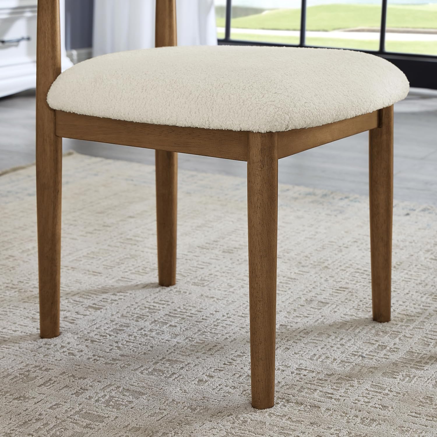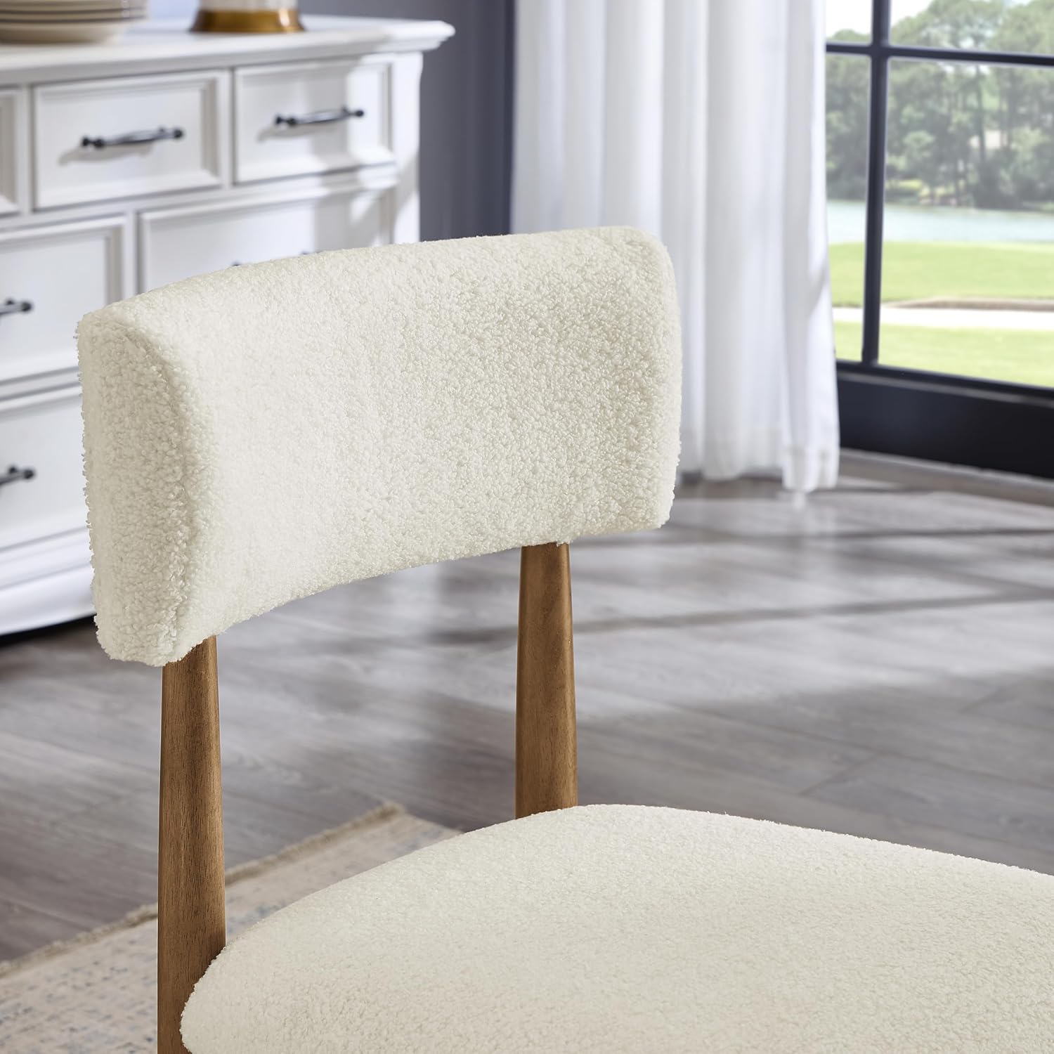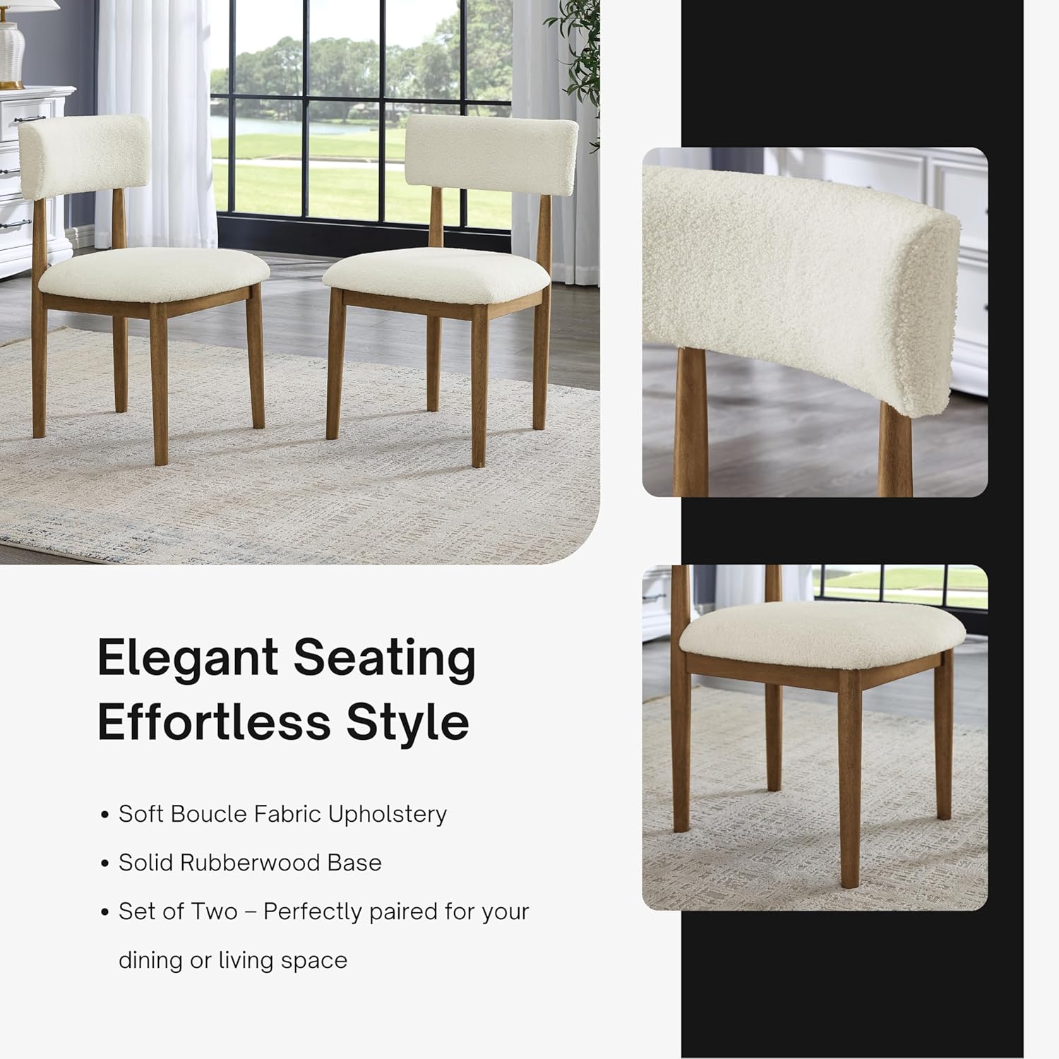 [TEXTURED & COZY UPHOLSTERY]: This eating chair incorporates a superbly curved design that blends completely along with your again, offering optimum consolation and help throughout meals. Its cozy boucle craftsmanship is made with looped white yarn on a clean background, making a comfortable but textured seating vibe. This eating chair not solely provides visible attraction but in addition enhances the tactile expertise.