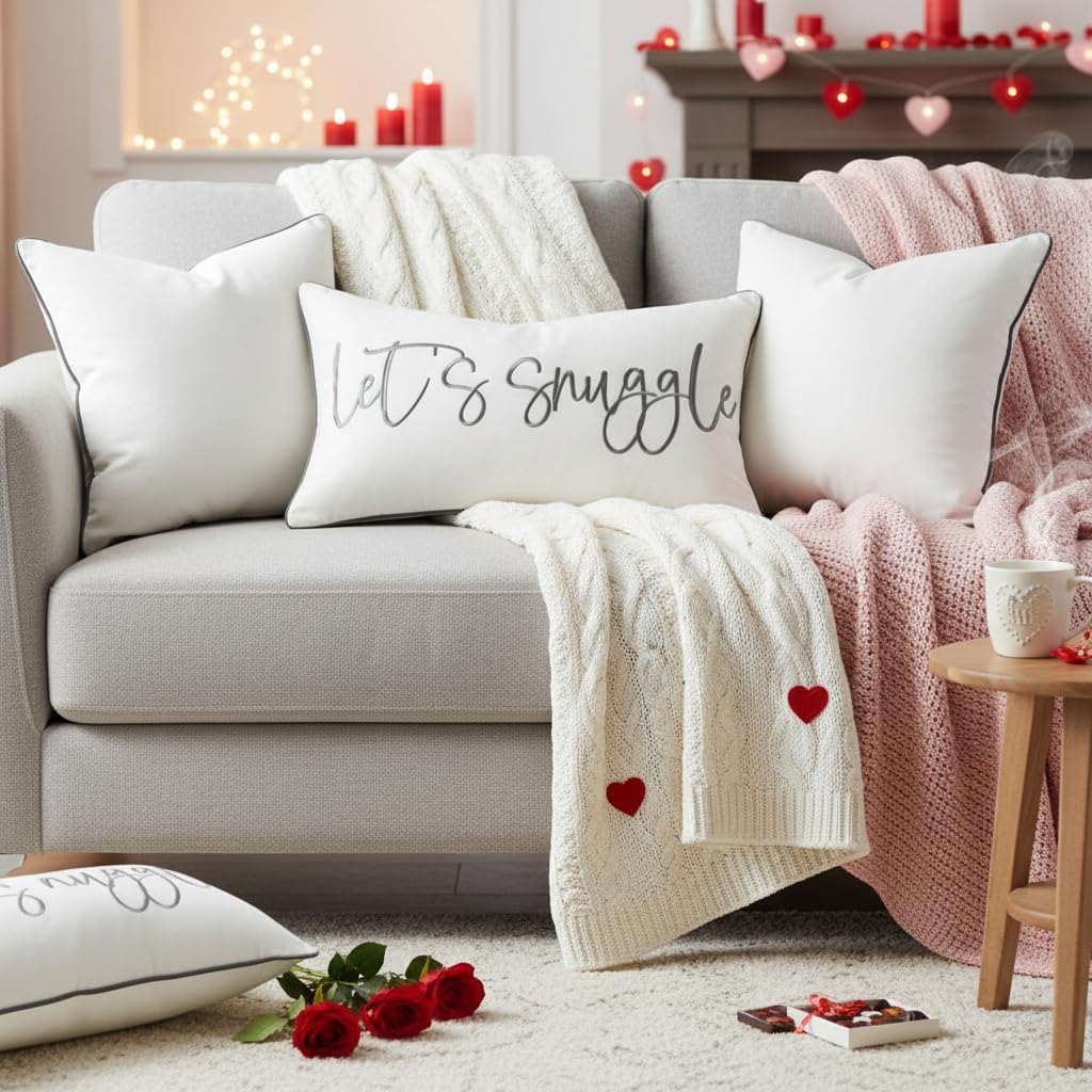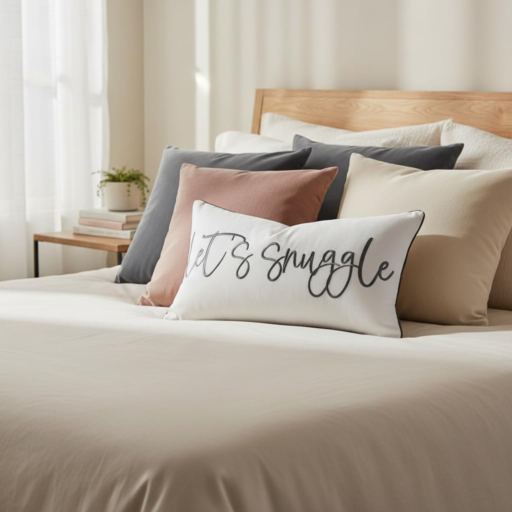 Sunkifover Let’s Snuggle Decorative Lumbar Pillow Cover – 12×20 Inch White and Grey Cotton Embroidery Throw Pillowcase for Bed, Bedroom, Living Room, Home Decor