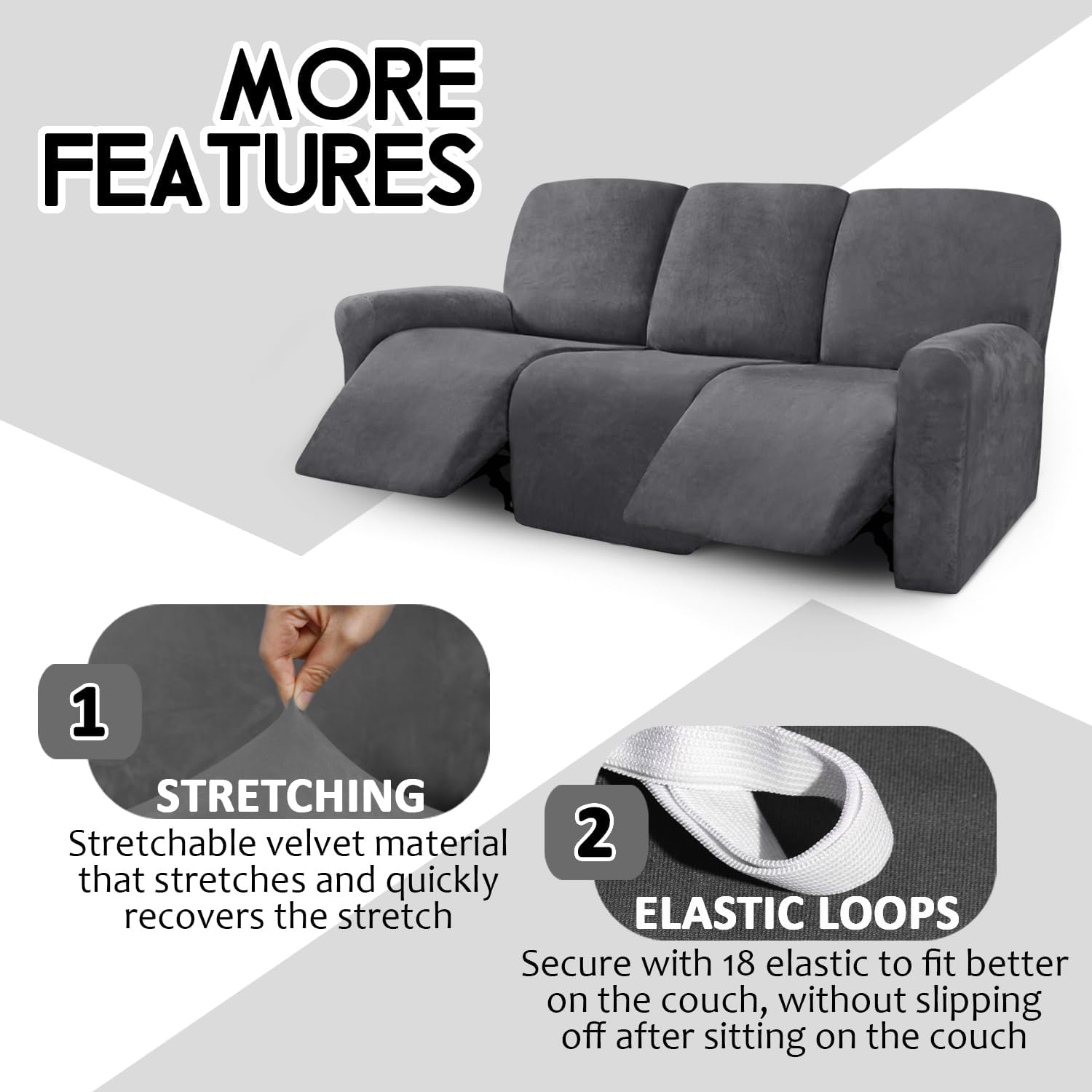 ULTICOR Velvet 8-Pieces Recliner Sofa Covers Stretch Reclining Couch Covers for 3 Cushion Reclining Sofa Slipcovers Furniture Covers Thick Soft Washable (3 Seater Recliner Cover, Dark Gray)