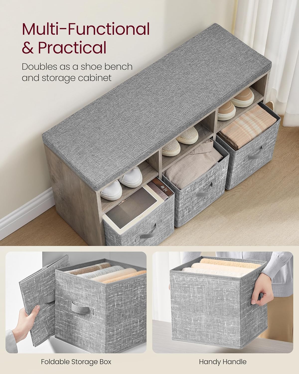 【SHOE BENCH WITH A CUSHION】After a protracted day at work, come residence and calm down on the snug cushion atop this shoe bench with storage containers. If it will get soiled, the detachable cushion cowl might be simply hand-washed