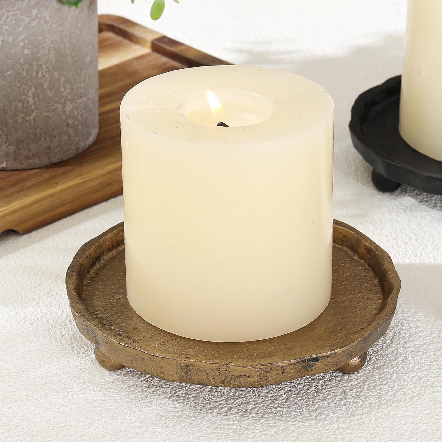 Rustic Cast Iron Design: Handcrafted from durable cast iron with a vintage brass finish, this pillar candle holder plate adds timeless charm and strength to your home décor.