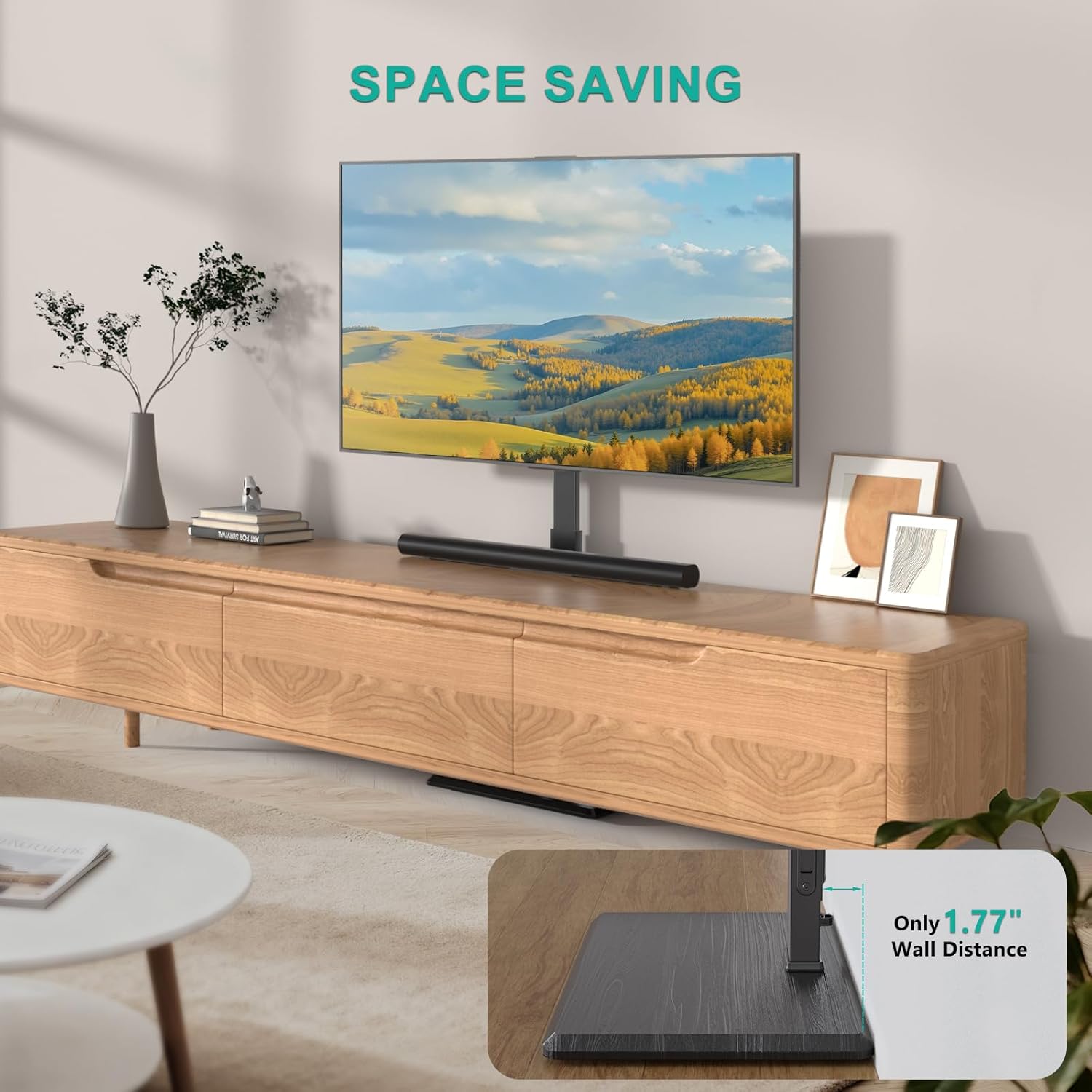 VIEWING ANGLE SWIVEL 60°: Conveniently swivel your TV stand +/-30° left or right to easily adjust screen direction, ensuring the best viewing angle anywhere in the room—ideal for college students, apartment dwellers, and homeowners