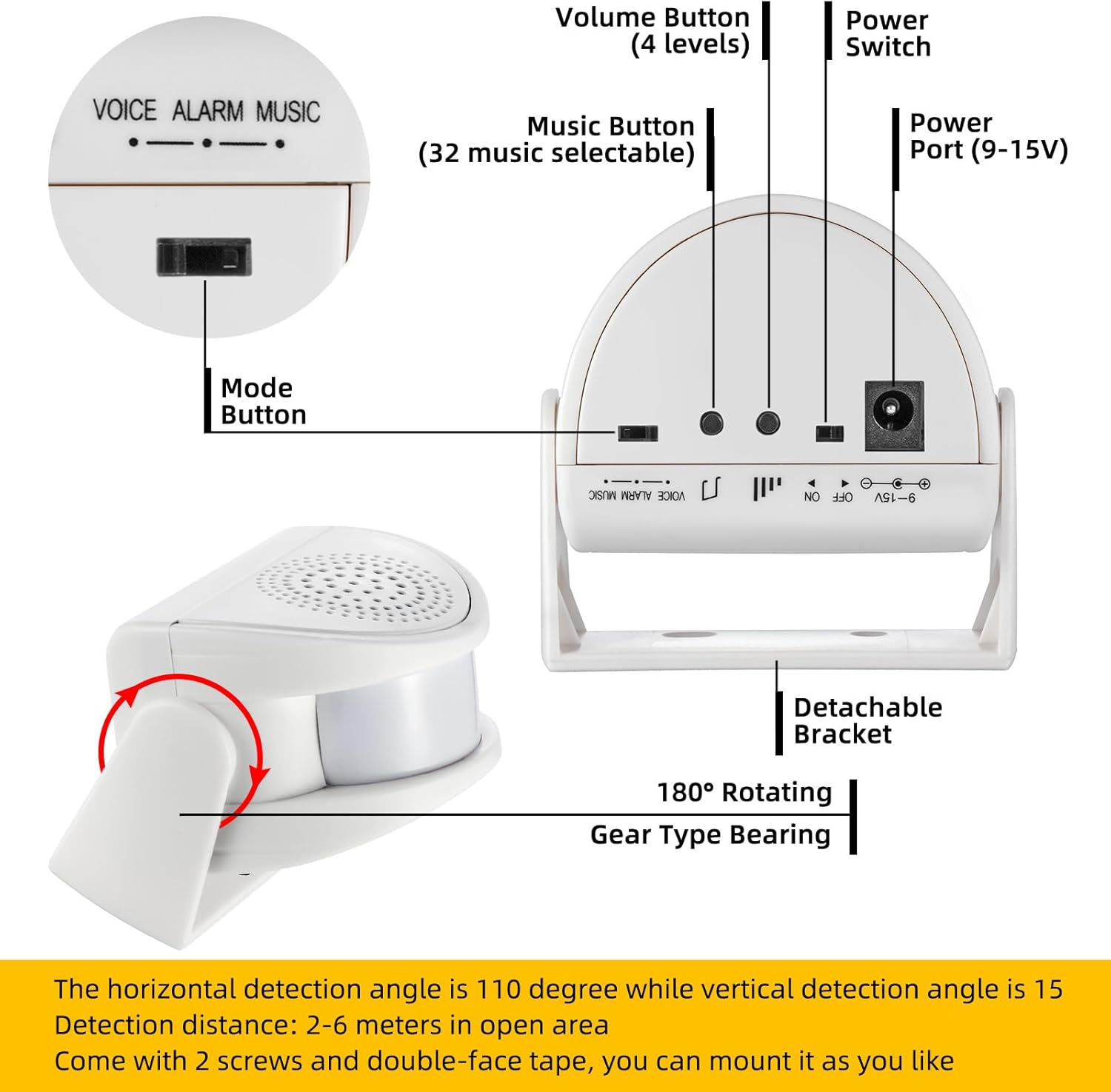Customizable Sound Modes:This versatile gadget affords a number of audio choices to create the proper welcoming ambiance. In Voice Mode, it greets guests with a transparent “Ding Dong, Hey, Welcome” message, whereas Music Mode supplies 32 built-in melodies to select from. With 4-step quantity management (0-90 dB) and mute functionality, you may simply alter the sound stage to go well with any enterprise or dwelling atmosphere. The nice chime immediately notifies you of buyer entry whereas sustaining an expert ambiance.
