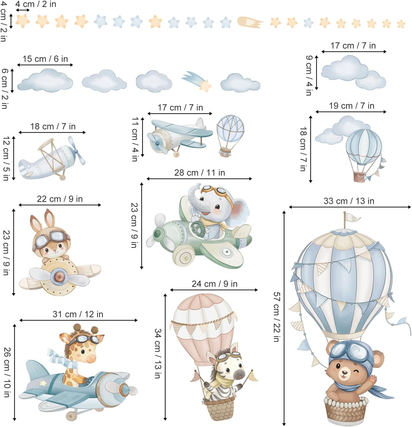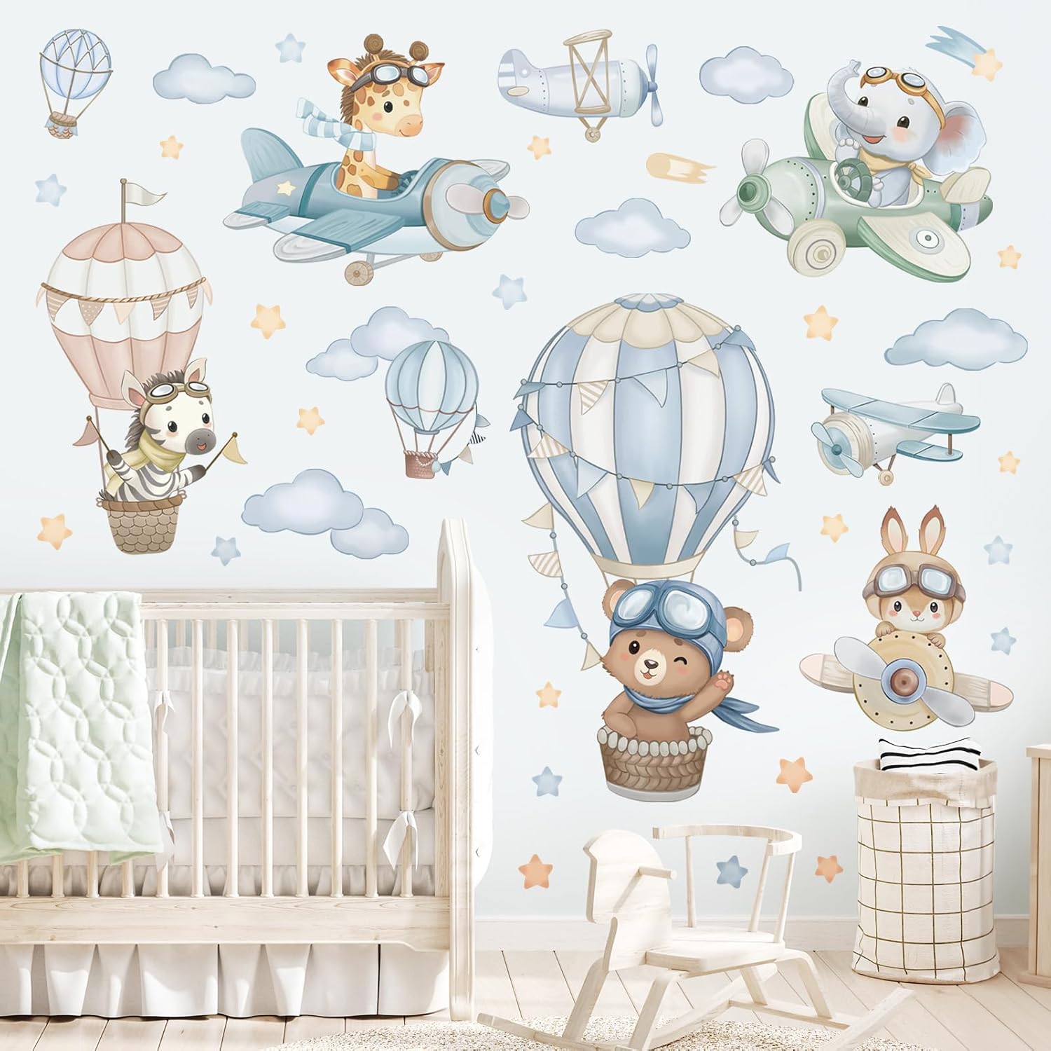 - Vibrant Watercolor Design: Features colorful depictions of a flying airplane, friendly bear, and majestic elephant suspended in hot air balloons against cloud backgrounds, creating a magical and engaging visual experience.