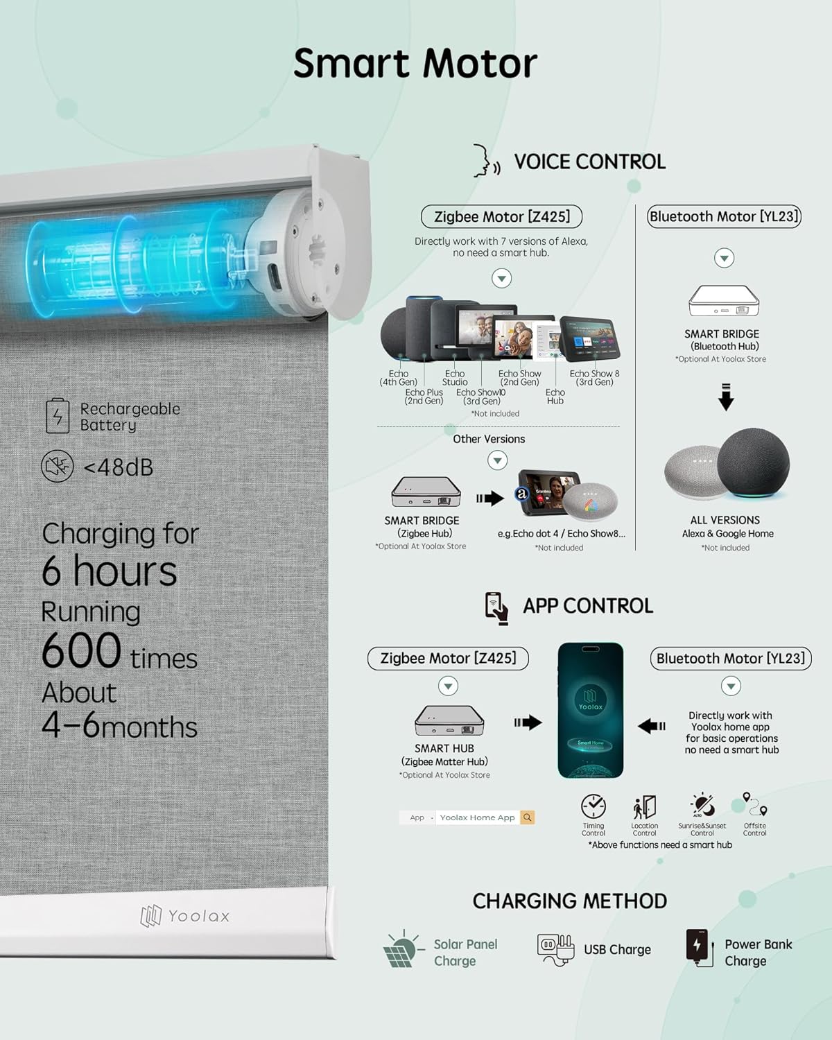 【Good Motor】With Zigbee Motor, Yoolax motorized blinds can Work with the next fashions of Alexa: Echo Plus 2nd Gen, Echo Present 2nd Gen, Echo Studio, Echo Present 10, Echo 4th Gen, Echo Present 8 third Gen, Echo Hub. No Good Hub is required. Bluetooth motor can Work with Yoolax Residence App with out Good Hub. Constructed-in rechargeable battery motor, the shades can be utilized for 4-6 months as soon as totally charged. Save much more vitality by buying photo voltaic panels to cost your curler shades