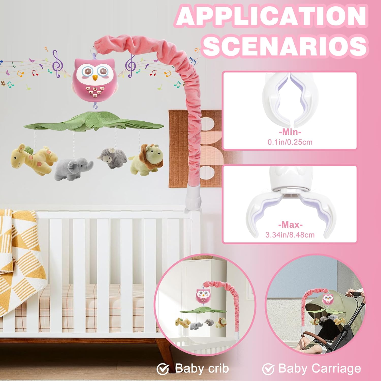 YUNGCHI Baby Crib Mobile with Music and Lights for Boys Musical Mobile Safari Animals for Girl Crib Bassinet Toys Hanging Portable Baby Mobile for Pack and Play Pink