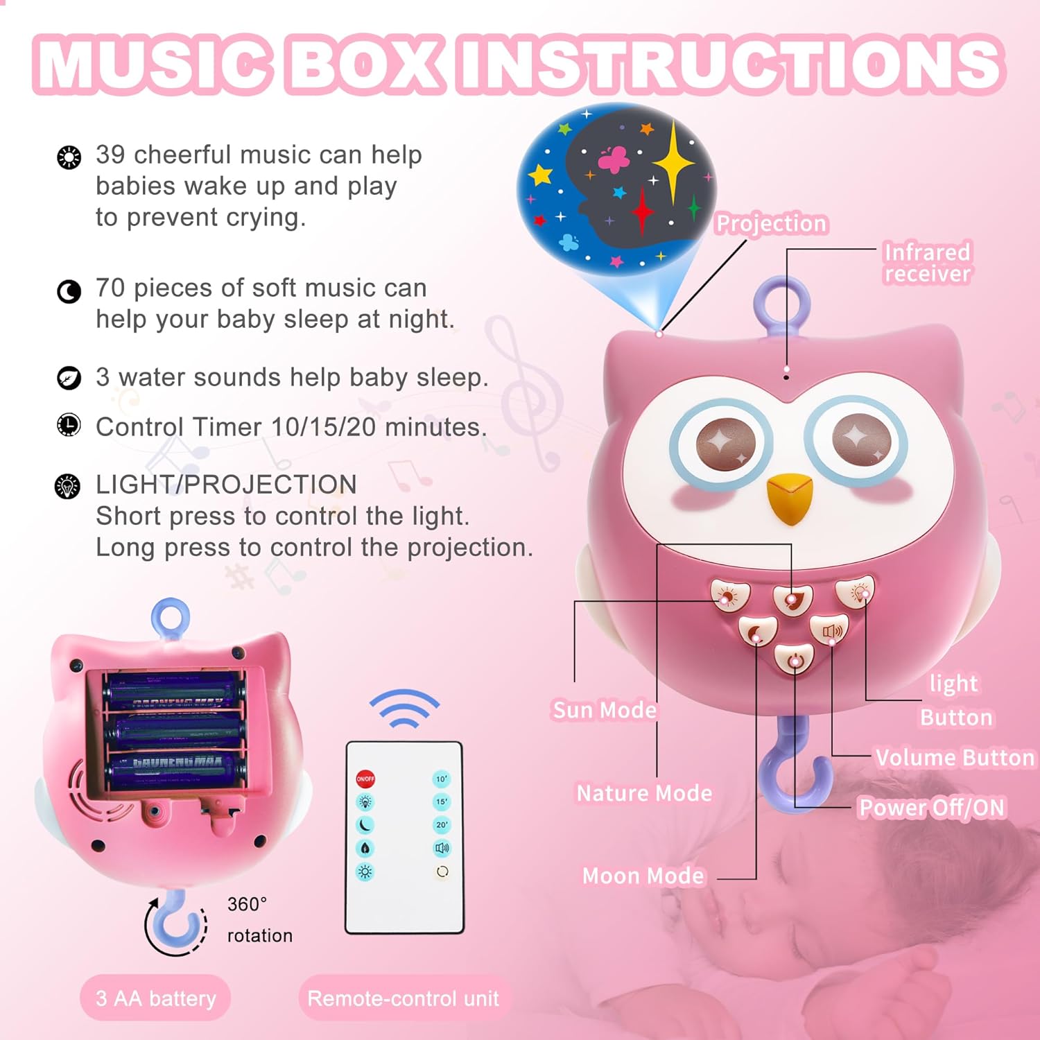 【Sound】The amount is controllable and contains three scene modes: pure, sunny, and moon. There are 109 songs and three water sound to select from. Light music will help infants relax and scale back crying.