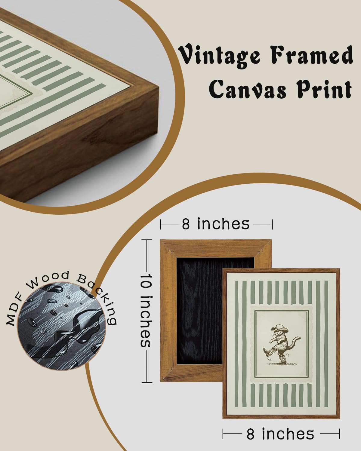 The vintage western framed wall art features a vintage boho-Western style. With a playful cowboy cat (in boots & hat) centered in an ornate border, layered over soft green vertical stripes, and framed in natural wood, it creates a whimsical, nostalgic, and charmingly eclectic atmosphere—ideal for spaces seeking Western fun with a cozy, boho twist.